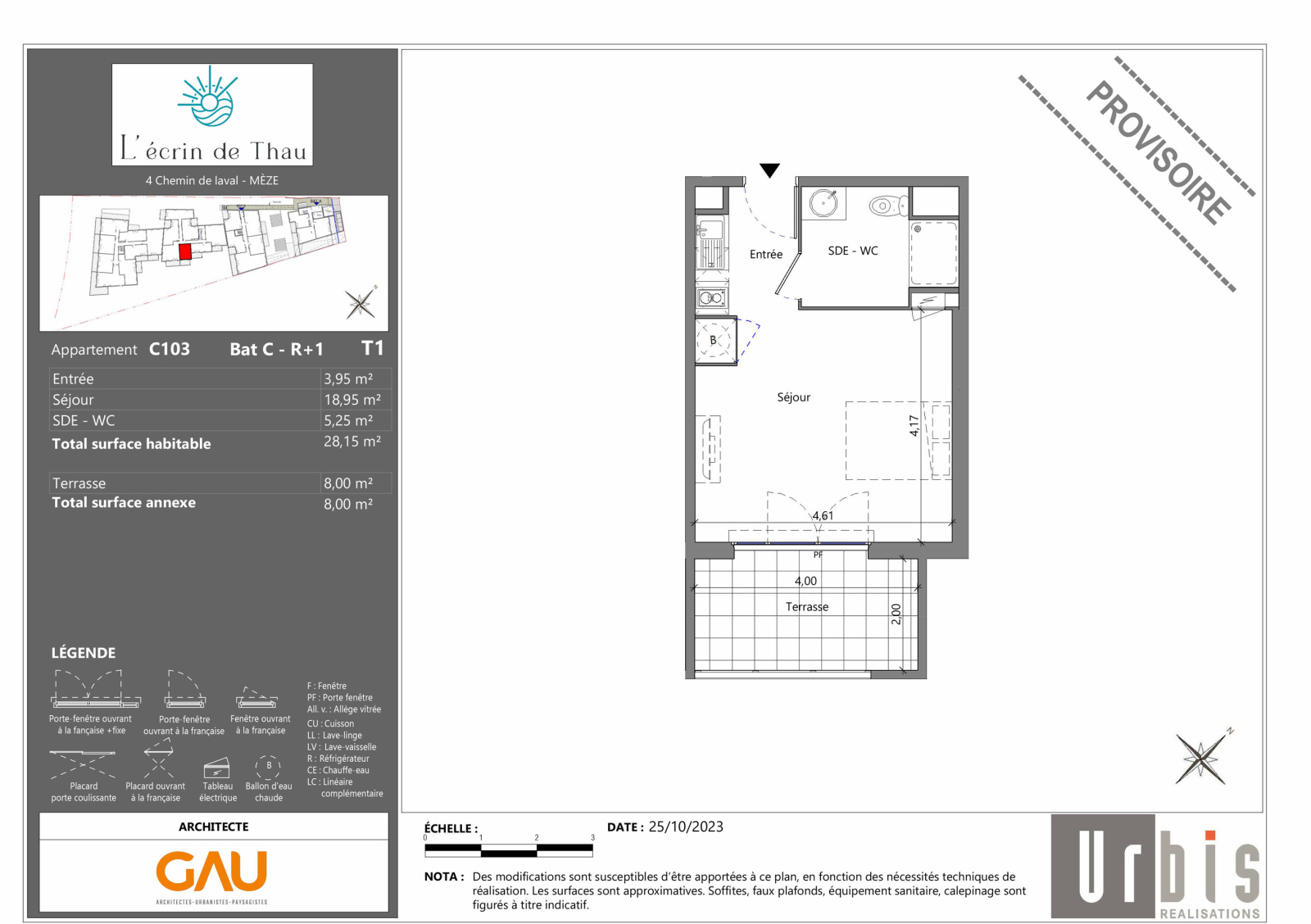 Dans la commune de Mèze, investir dans l'immobilier avec un appartement doté d'une grande terrasse bien exposée facile à louer et parfait pour profiter d'une réduction d'impôts. Dans un nouveau programme neuf dont la construction s'achèvera en 2026. L'appartement se trouve au dernier niveau sur 1 ; le bâtiment est équipé d'un ascenseur. Si vous êtes en phase d'étude du marché préalablement à votre premier achat, contactez-nous ! Pour plus d'informations, vous pouvez contacter votre agence immobilière IMOBOOK. Habitation comprenant un coin salon de 18.95m², une salle d'eau et un espace cuisine. Sa surface plancher habitable est de précisément 28.15m² loi Carrez. Est conforme aux normes des bâtiments label de bâtiment à basse consommation garantissant des économies d'énergie au quotidien. Tranquillité assurée grâce au double vitrage. À l'extérieur, le bien vous offre une terrasse d'une surface de 8m², ce qui porte la surface de l'ensemble à 36.15m². Il vous fait bénéficier d'une place de parking privative.