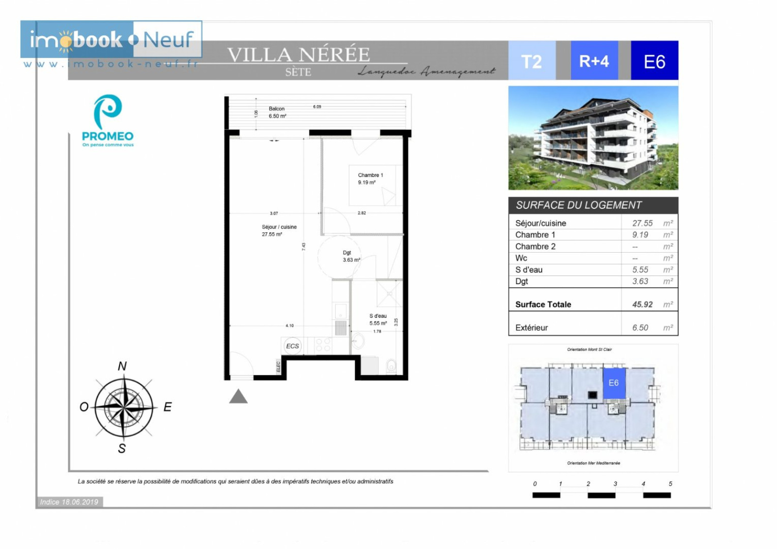 Résidence Villa Nérée, Côté Corniche, Dans une résidence de standing BBC RT2012, au 4e étage sur 5, T2 de 45,92m² avec terrasse de 6,5m² composé d'un séjour/cuisine de 27,55m², une chambre, une salle d'eau avec WC. Une place de parking en sous-sol incluse. Chauffage individuel par climatisation réversible (pièce principale) et électrique rayonnant (chambres), ballon d'eau chaude thermodynamique, salles d'eau et salles de bains équipées, menuiseries double vitrage alu avec volets électriques, ascenseur, espaces verts, local à vélo, ... Frais de notaire réduits. Livraison 3e trimestre 2021. Lot E06. Autres lots disponibles.