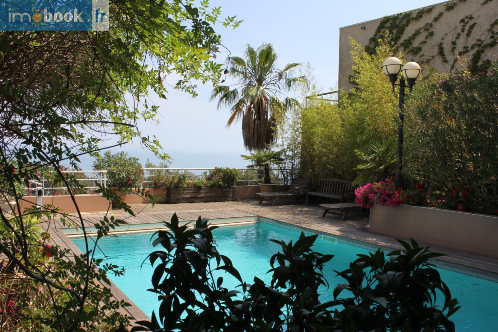 Chemin de la Mogeire, Côté St Clair Sud, Cette maison en très bon état (de 2004) exposée plein sud bénéficie d'un panorama exceptionnel sur la mer à 180°. Elle offre une surface habitable de plus de 400m² sur 4 niveaux desservis par un ascenseur. Au rez-de-jardin : Un studio de 25m² avec salle d'eau et WC, 2 garages avec portails électriques, cave à vin. Au premier étage : 4 chambres dont une avec salle de bains s?ouvrant toutes sur une grande terrasse, une salle de bains, buanderie, WC. Au deuxième étage : immense espace comprenant salon avec cheminée, salle à manger, superbe cuisine, cellier-buanderie et WC indépendant. Une très belle terrasse offrant une vue magnifique sur la mer prolonge l'ensemble. Le salon donne également de plain-pied sur une deuxième terrasse et sa belle piscine chauffée de 10X4m avec volet roulant, hammam avec douche et toilettes. Au troisième étage : une suite parentale avec dressing, salle de bains et WC, un petit salon télévision-bureau-bibliothèque donnants sur une vaste. Toutes les terrasses (y compris le toit terrasse et le boulodrome attenant), sont accessibles par des escaliers extérieurs. Prestations remarquables. Terrain clos de 1732m² en restanques. Bien unique !