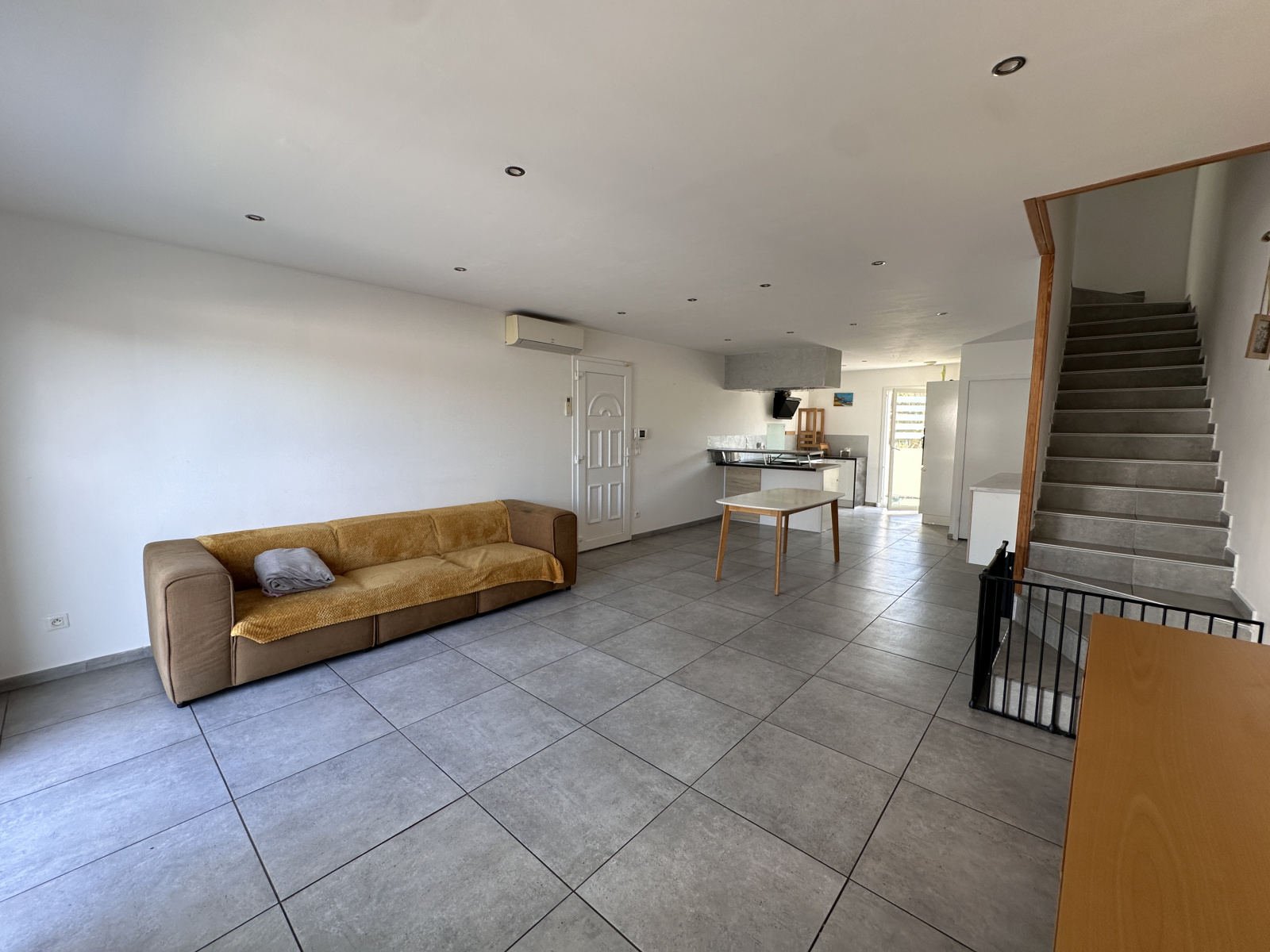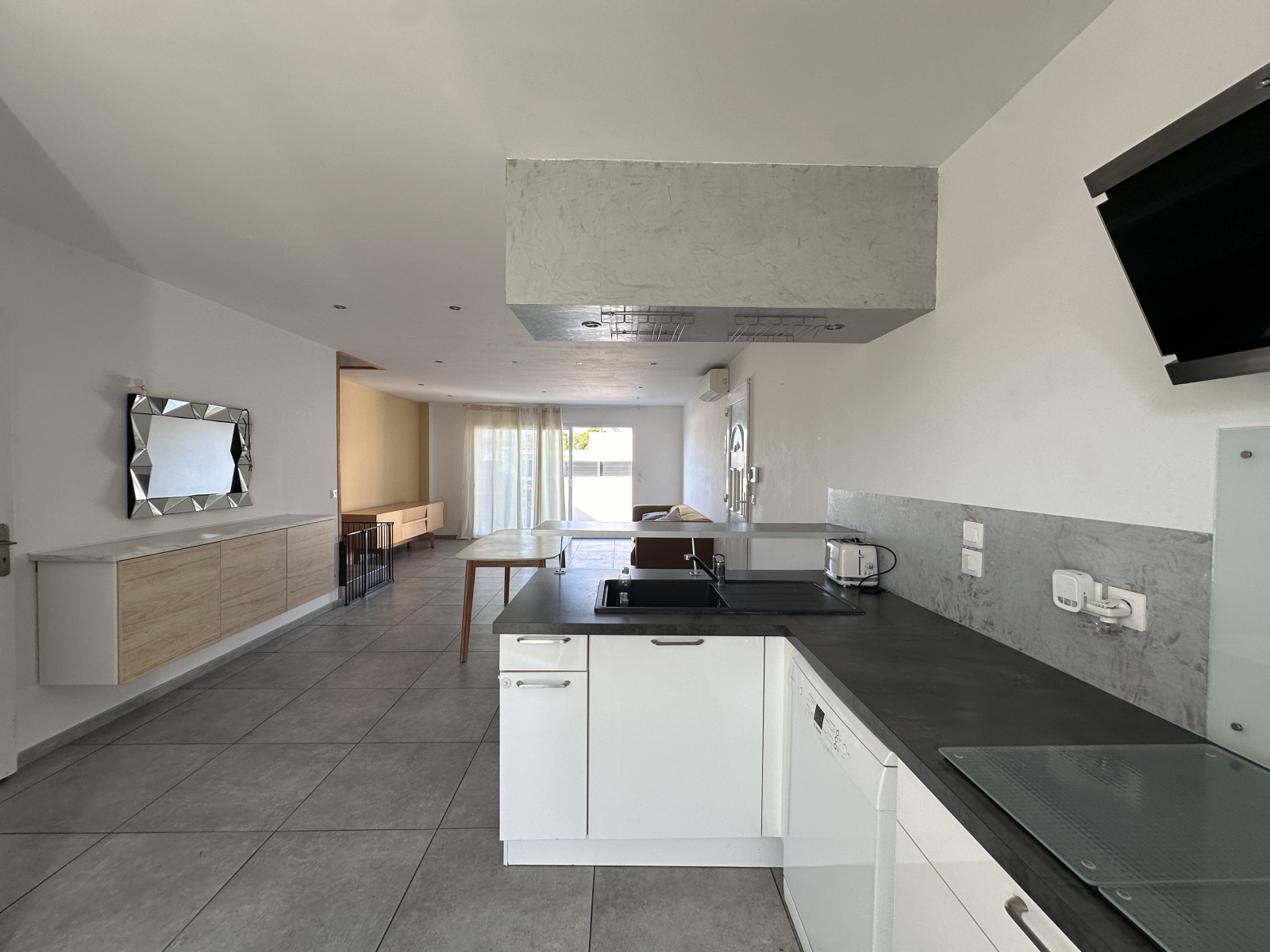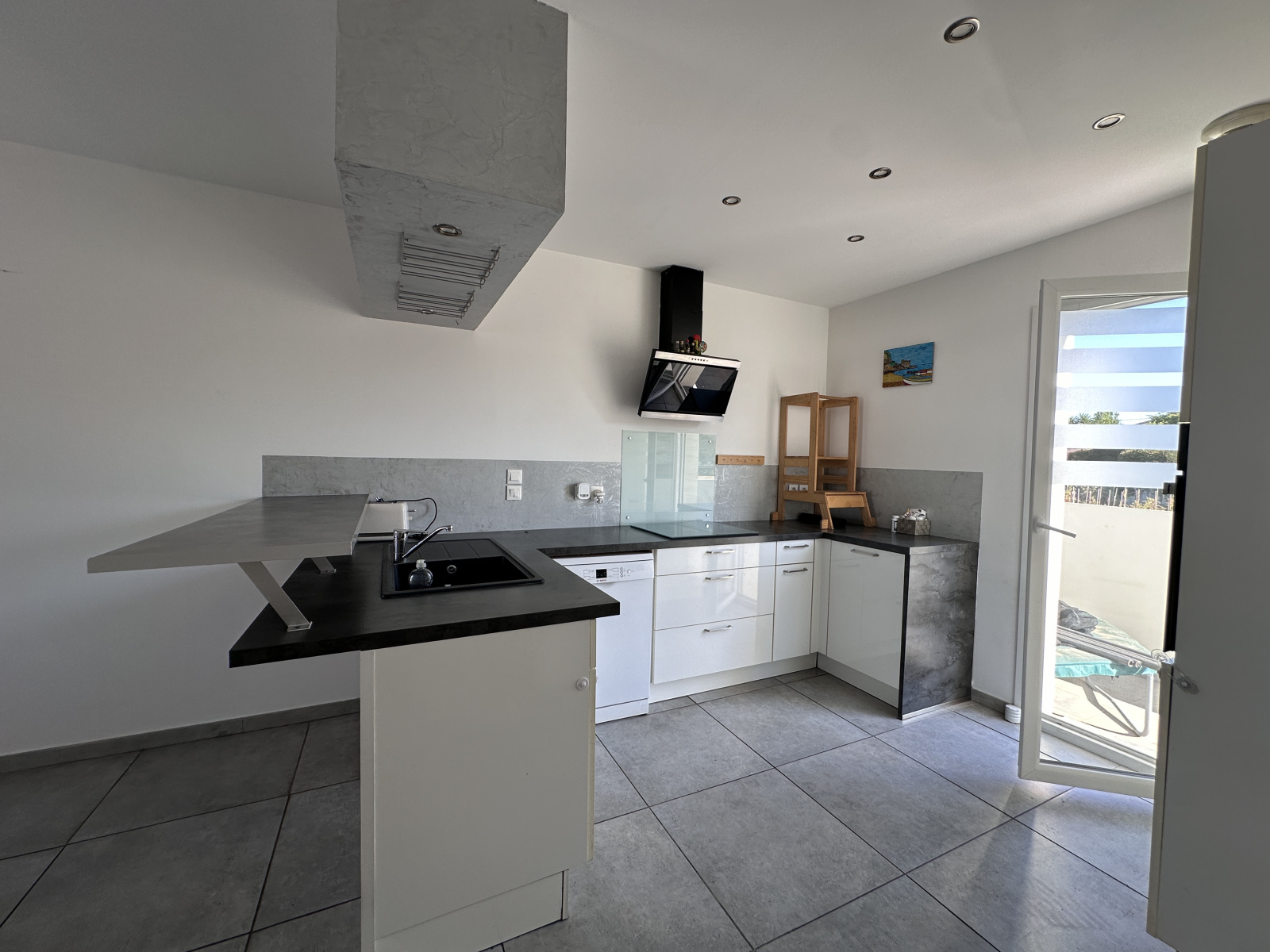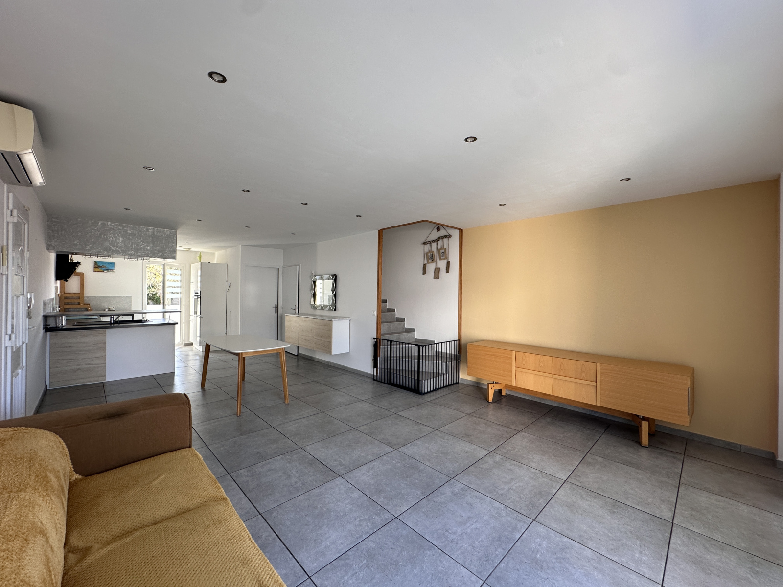 Elle se compose au rez-de-chaussée d'un espace salon-séjour donnant sur la cuisine équipée et aménagée. Sur le même niveau, vous profiterez d'une buanderie et d'un vide sous-escalier.